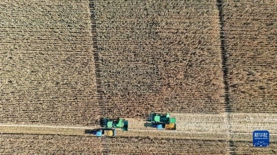 10月19日,在中國(guó)科學(xué)院“黑土糧倉(cāng)”科技會(huì)戰(zhàn)長(zhǎng)春示范區(qū)公主嶺示范基地,無(wú)人駕駛農(nóng)機(jī)在收獲玉米(無(wú)人機(jī)照片)。