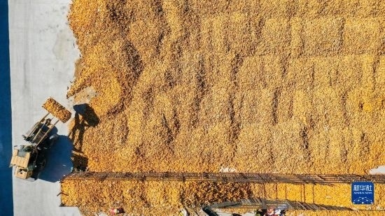 10月19日,在吉林省公主嶺市友忠種植農(nóng)民專業(yè)合作社,農(nóng)民將收獲的玉米放入科學(xué)儲(chǔ)糧倉(cāng)(無(wú)人機(jī)照片)。