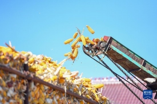 10月19日,在吉林省公主嶺市友忠種植農(nóng)民專業(yè)合作社,農(nóng)民將收獲的玉米放入科學(xué)儲(chǔ)糧倉(cāng)。