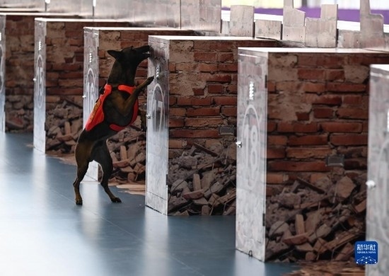11月8日,搜救犬訓(xùn)導(dǎo)員和搜救犬在比賽中。