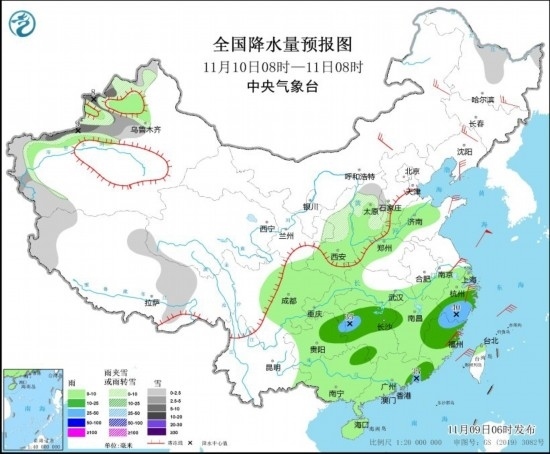 11月9日08時(shí)至10日08時(shí),新疆西部、內(nèi)蒙古東北部、黑龍江大部、吉林中東部、遼寧東北部等地部分地區(qū)有小到中雪或雨夾雪,其中,黑龍江東部、吉林東部、新疆南疆西部山區(qū)等地部分地區(qū)有大雪,局地暴雪。重慶東南部、貴州東部、湖北東部、湖南大部、蘇皖南部、上海、江西中北部、浙江大部、福建西北部以及廣西東北部等地部分地區(qū)有中到大雨,其中,江西西部和東北部、浙江西南部、福建西北部等地部分地區(qū)有暴雨(50~80毫米)。內(nèi)蒙古中東部、遼寧大部、華北東部和北部、黃淮北部、江南東部等地部分地區(qū)有4~6級(jí)風(fēng)(見(jiàn)圖3)。