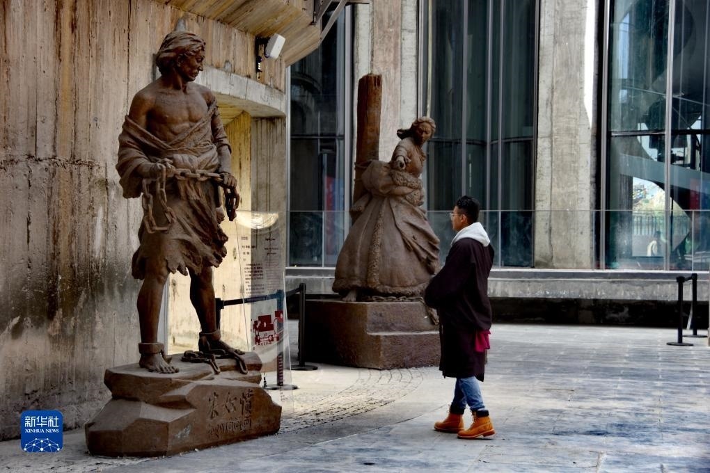 11月15日,觀眾在西藏美術(shù)館參觀雕塑作品。新華社記者 劉文博 攝