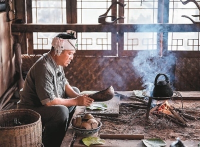 景邁山芒景村的布朗族茶農在火塘邊做烤茶。