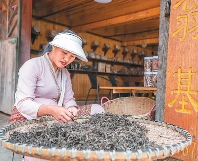 景邁山翁基古寨的布朗族茶農在挑揀茶葉。