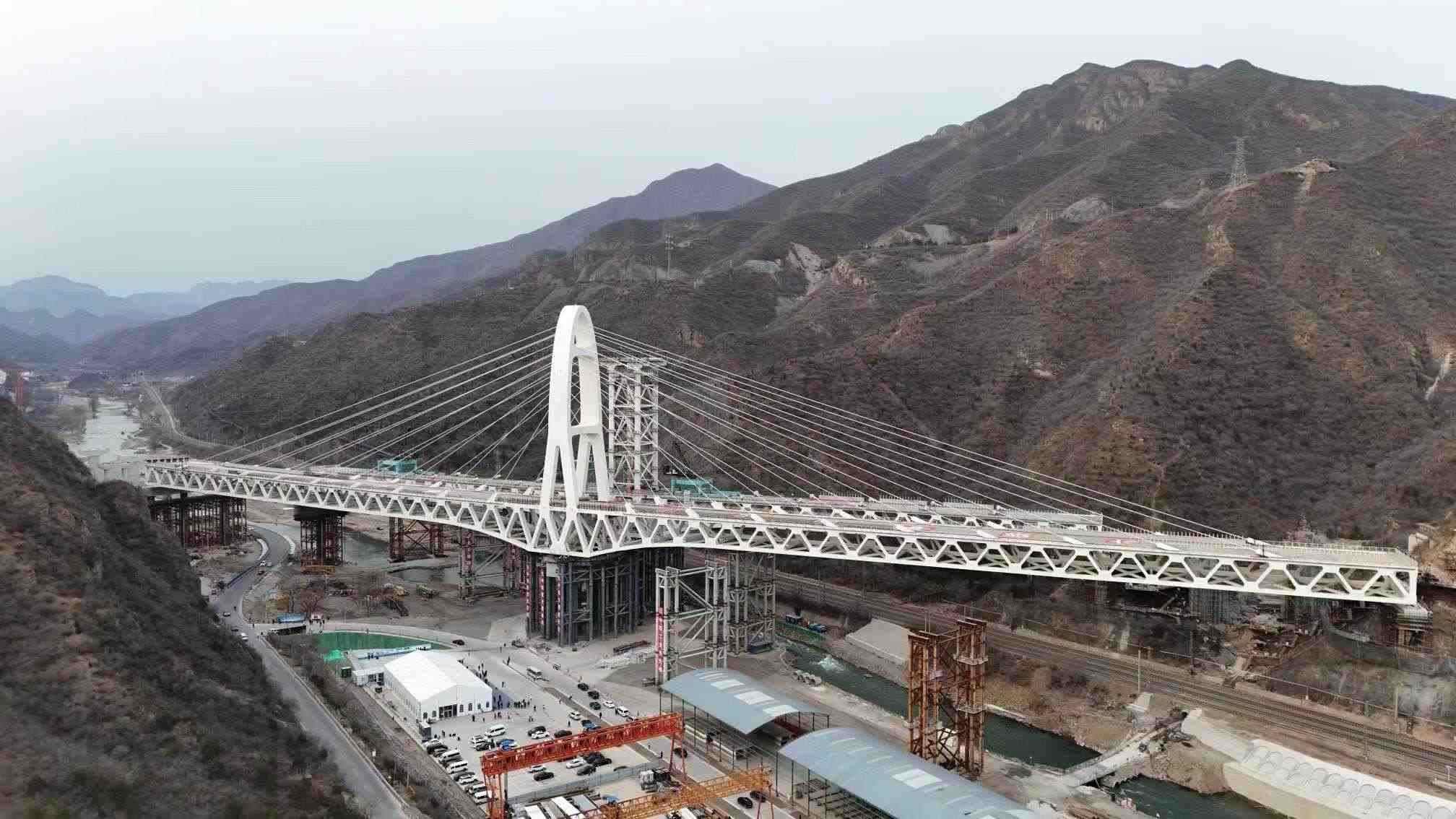 左、右兩幅風(fēng)格相異卻又錯(cuò)落有致的大橋屹立山間,氣勢恢宏、蒼勁挺拔,曲線梁體與橋塔造型相得益彰,更顯線條剛?cè)岵?jì),白色外觀色澤明快,與周圍山光水景完美融合。轉(zhuǎn)體施工現(xiàn)場井然有序,參建各方密切配合,大橋在人們的注視中緩緩轉(zhuǎn)動(dòng),像兩個(gè)舞者翩翩起舞,最終兩幅大橋在永定河上方牽手成功,贏得人們陣陣歡呼喝彩。