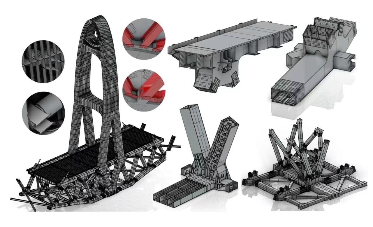 “本橋曲線鋼桁梁構(gòu)造異常復(fù)雜,鋼塔外形為半橢圓變截面,桁架近萬根桿件空間定位要求嚴(yán)絲合縫。為了準(zhǔn)確表達(dá)每個(gè)細(xì)節(jié),我們采用了BIM正向設(shè)計(jì)思路,探索出設(shè)計(jì)—建?!蓤D一體化的設(shè)計(jì)流程,開發(fā)出自動(dòng)化建模功能和智能化出圖系統(tǒng),為施工企業(yè)和鋼梁制造廠提供高精度的模型和批量圖紙,精準(zhǔn)表達(dá)復(fù)雜的結(jié)構(gòu)信息和設(shè)計(jì)意圖,打通了設(shè)計(jì)—制造—施工全過程信息傳遞路徑,有效節(jié)約了工期與造價(jià)?!敝需F設(shè)計(jì)集團(tuán)大橋項(xiàng)目主管總工彭嵐平向我們講述了大橋采用的最新智能化設(shè)計(jì)手段。