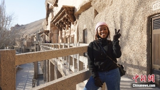 圖為萊索托留學生茉莉在敦煌莫高窟進行參觀。受訪者供圖