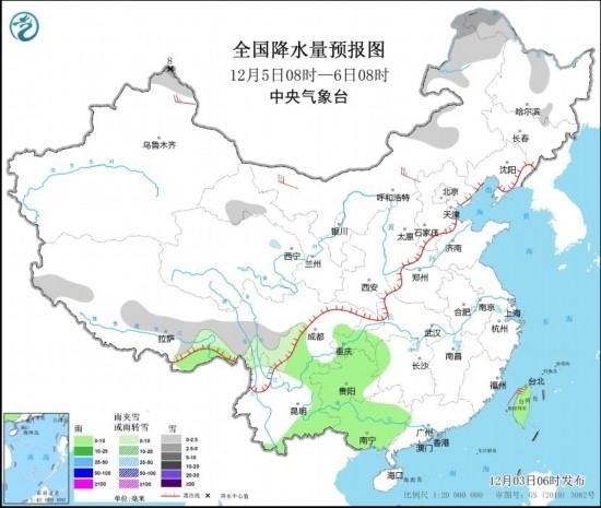 全國降水量預(yù)報(bào)圖(12月5日08時-6日08時)