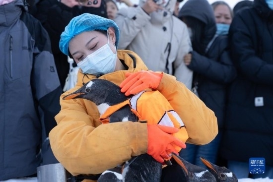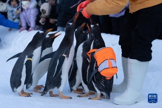 時值周末,哈爾濱極地公園的企鵝亮相戶外,上演冰雪巡游,吸引許多游客前來觀賞。目前正是黑龍江省哈爾濱市的冰雪旅游季。