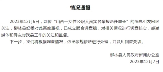 ·山西女子實名舉報兩任局長受賄玩弄女性,柳林縣紀委:已經(jīng)成立聯(lián)合調(diào)查組。
