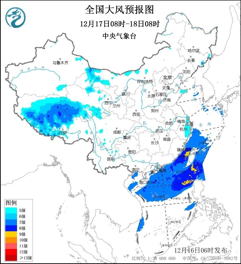 預計,12月16日08時至17日08時,內蒙古中東部、西藏中西部、甘肅河西、河北北部、山東半島東部、江蘇南部、上海、浙江大部等地有5~6級、陣風7~8級的大風,其中,西藏西北部的部分地區(qū)有7~8級、陣風9~10級的大風;渤海、渤海海峽、黃海大部海域、東海大部海域、臺灣海峽、臺灣以東洋面、巴士海峽、南海北部和中部海域、北部灣將有7~8級、陣風9~10級的大風,其中臺灣海峽、巴士海峽和南海東北部的部分海域風力可達9級、陣風10~11級。