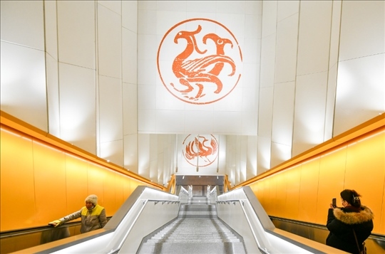 17號(hào)線太陽宮站里,仿佛照射進(jìn)太陽金光,站廳里的暖陽壁畫、上下扶梯時(shí)墻壁上的神鳥瓦當(dāng),都有不少乘客舉著手機(jī)拍照。
