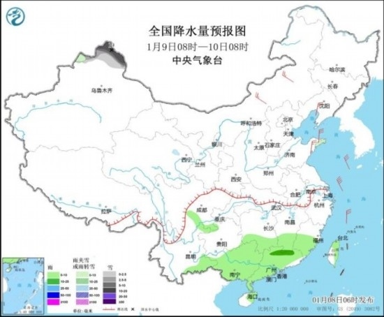 1月9日08時(shí)至10日08時(shí),新疆西北部有小到中雪或雨夾雪,部分地區(qū)有大雪或暴雪(10~19毫米)。四川盆地南部、云南東南部、江南南部、華南大部等地部分地區(qū)有小到中雨。內(nèi)蒙古中東部、遼寧、山東半島等地部分地區(qū)有4~5級(jí)風(fēng)。東海南部海域?qū)⒂?~7級(jí)風(fēng),陣風(fēng)8級(jí)。