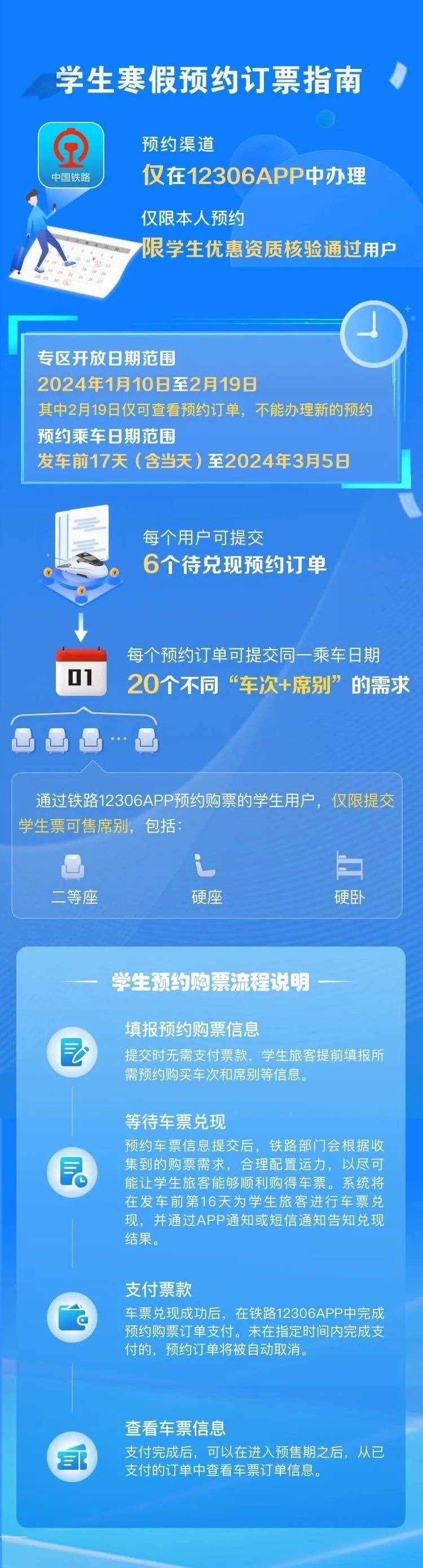 為認(rèn)真貫徹落實(shí)黨中央國(guó)務(wù)院關(guān)于做好2024年元旦春節(jié)期間有關(guān)工作的要求,保障學(xué)生、務(wù)工人員等重點(diǎn)群體春運(yùn)出行,鐵路12306創(chuàng)新服務(wù)舉措,為學(xué)生、務(wù)工人員推出了售票服務(wù)專區(qū)。自1月10日起,符合條件的學(xué)生旅客(已通過(guò)學(xué)生優(yōu)惠資質(zhì)核驗(yàn)且有剩余優(yōu)惠乘車次數(shù))可通過(guò)“學(xué)生寒假訂票專項(xiàng)服務(wù)”專區(qū)預(yù)約購(gòu)買春運(yùn)期間(1月26日至3月5日)火車票,每名旅客最多可同時(shí)提交6個(gè)預(yù)約訂單,每個(gè)訂單可添加1個(gè)乘車日期的20個(gè)“車次+席別”的組合,可選席別為學(xué)生優(yōu)惠票適用的硬座、硬臥、二等座。已通過(guò)實(shí)名制核驗(yàn)的務(wù)工人員可通過(guò)“務(wù)工人員春運(yùn)預(yù)約訂票服務(wù)”專區(qū)預(yù)約購(gòu)買春運(yùn)期間火車票,每名旅客可同時(shí)提交6個(gè)預(yù)約訂單,每個(gè)訂單可選擇“時(shí)間+車次+席別”的1個(gè)組合。