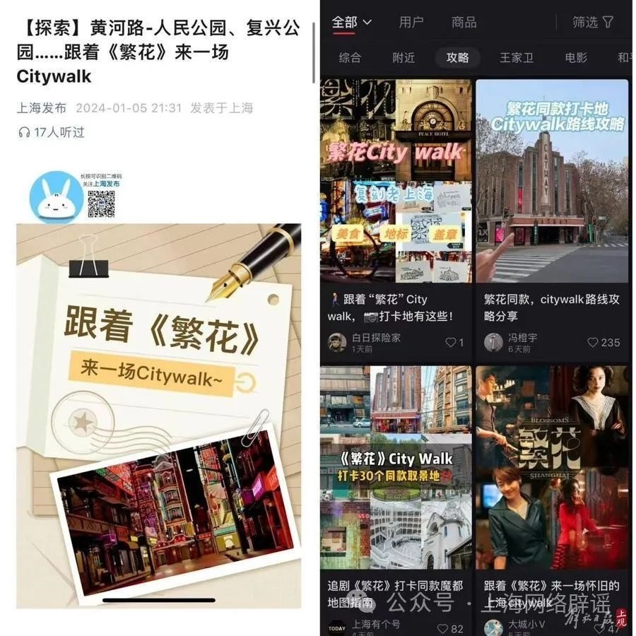 可見,所謂的“繁花Citywalk收費(fèi)”大概率是部分自媒體為蹭熱點(diǎn)而編造的內(nèi)容。以上做法又引來更多看中“上?!绷髁康牟┲?,不加調(diào)查求證,妄加議論,進(jìn)一步推動(dòng)了不實(shí)信息傳播。