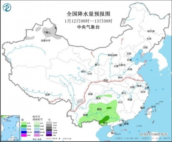 全國降水量預報圖(1月12日08時-13日08時)
