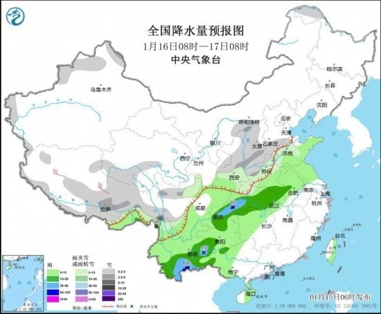 圖1 全國降水量預(yù)報圖(1月15日08時-16日08時)