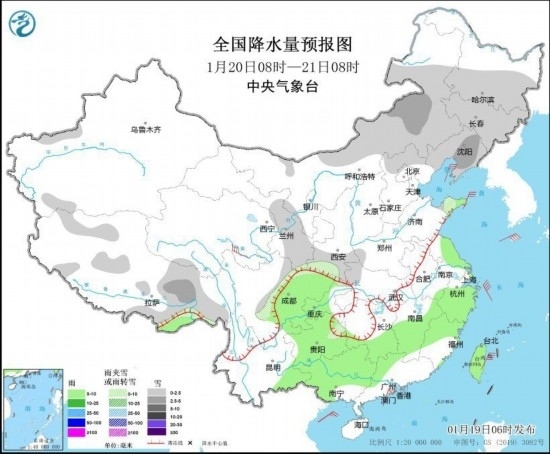 1月19日08時(shí)至20日08時(shí),內(nèi)蒙古中部、遼寧西部、新疆沿天山地區(qū)、甘肅河西、陜西北部和南部、山西、河南西部、山東東部、安徽北部、湖北北部等地部分地區(qū)有小雪或雨夾雪,其中,內(nèi)蒙古中部、陜西北部、河北北部等地部分地區(qū)有中到大雪(5~9毫米)。江淮西部、江南大部、西南地區(qū)東南部、華南北部等地部分地區(qū)有中到大雨,其中,廣西北部等地局地有暴雨(50~65毫米)。內(nèi)蒙古中西部、江蘇北部部分地區(qū)有4~6級(jí)風(fēng)。渤海、黃海大部、臺(tái)灣海峽將先后有6~7級(jí)、陣風(fēng)8級(jí)的東北到偏北風(fēng)(見圖1)。