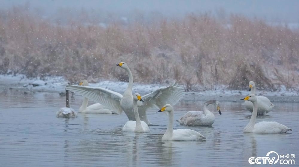 山西運(yùn)城迎來降雪天氣,成群天鵝在鹽湖濕地嬉戲。