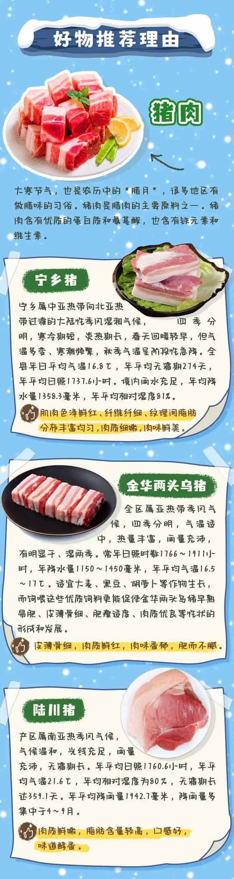 大寒節(jié)氣除了吃糯米飯外,還有一個(gè)習(xí)俗就是做臘肉、吃臘肉。“冬臘風(fēng)腌,蓄以御冬”,這個(gè)時(shí)節(jié),最適合風(fēng)干制作臘味。豬肉,是臘肉的主要原材料之一。我國(guó)的養(yǎng)豬史,最早可以追溯到新石器時(shí)代,目前豬肉產(chǎn)區(qū)可以說(shuō)是遍布全國(guó),不同地區(qū)的豬肉也有不同的特色和風(fēng)味。
