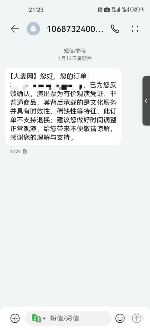 周女士說自己第一時(shí)間就通過多個(gè)渠道嘗試退票,但都沒有成功?!叭斯た头墓ぷ鲿r(shí)間是早上9點(diǎn)到晚上8點(diǎn),我打電話的時(shí)候不在他們工作時(shí)間范圍內(nèi)。當(dāng)時(shí)也確實(shí)聯(lián)系不到其他渠道,于是我就在12315,包括黑貓投訴進(jìn)行退票退款的申請(qǐng)。13號(hào)早上9點(diǎn),大麥客服說此訂單不支持退換,13號(hào)下午1點(diǎn)半的時(shí)候,給了我一個(gè)反饋短信,說是已為我反饋確認(rèn),演出票為有價(jià)觀影憑證非普通商品,其背后承載的是文化服務(wù),并具有時(shí)效性、稀缺性等特征,此訂單不支持退換,然后就建議我做好時(shí)間調(diào)整正常觀演?!?/p>