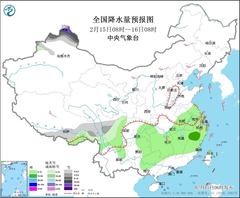 2月15日08時至16日08時,新疆北部、西藏東部和南部、川西高原中北部等地部分地區(qū)有小到中雪或雨夾雪,其中,新疆阿勒泰地區(qū)有大到暴雪,部分地區(qū)有大暴雪,局地特大暴雪(30~35毫米)。江淮大部、江漢東部、江南、西南地區(qū)東部、華南西部等地部分地區(qū)有小到中雨。西藏中部、內(nèi)蒙古大部、遼寧西部、遼東半島、山東半島、江蘇南部、上海、湖南中北部等地部分地區(qū)有4~6級風(fēng),其中,浙江中東部部分地區(qū)有6~7級風(fēng);黃海大部海域、東海大部海域、臺灣海峽有7~8級、陣風(fēng)9級的大風(fēng)(見圖3)。