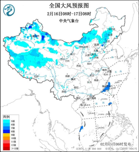 中央氣象臺2月15日06時繼續(xù)發(fā)布大風(fēng)藍色預(yù)警。預(yù)計,2月15日08時至16日08時,新疆北疆北部和南疆盆地、內(nèi)蒙古中西部、青海西部、甘肅西部、江蘇東部、上海大部等地將有5~6級、陣風(fēng)7級的大風(fēng);黃海大部海域、東海大部海域、臺灣海峽將有7~8級、陣風(fēng)9級的大風(fēng)(見圖1)。2月16日08時至17日08時,新疆北疆北部和南疆盆地、西藏北部、內(nèi)蒙古中西部、青海西部、甘肅西部、遼寧東部、吉林東部等地將有5~6級、陣風(fēng)7級的大風(fēng),其中新疆北部的部分地區(qū)將有7~8級、陣風(fēng)9級的大風(fēng);東海西南部海域、臺灣海峽將有7~8級、陣風(fēng)9級的大風(fēng)(見圖2)。