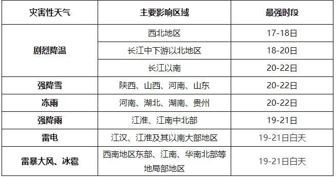 央視網(wǎng)消息:中央氣象臺預(yù)計,2月17日至22日寒潮天氣將影響我國,中東部地區(qū)氣溫起伏劇烈,大部地區(qū)降溫10~18℃,局地氣溫降幅可達20℃以上;全國大部有明顯雨雪天氣,其中陜西、山西、河南、山東等地有暴雪,局地大暴雪;河南、湖北、湖南、貴州將先后出現(xiàn)凍雨;江淮、江南中北部局地有暴雨,南方地區(qū)有大范圍雷電和局地強對流天氣。