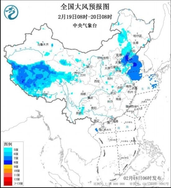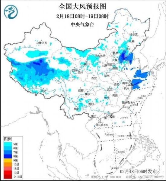 2月18日8時(shí)至19日8時(shí),新疆南疆盆地東部、西藏中西部、青海南部、甘肅河西、內(nèi)蒙古中西部、遼寧中西部等地將有5~6級(jí)、陣風(fēng)7~8級(jí)的大風(fēng);渤海、渤海海峽、黃海北部海域、東海北部海域?qū)⒂?~8級(jí)、陣風(fēng)9~10級(jí)的大風(fēng)。2月19日8時(shí)至20日8時(shí),西藏中西部、青海南部、甘肅河西、內(nèi)蒙古中東部、遼寧西部和南部等地將有5~6級(jí)、陣風(fēng)7~8級(jí)的大風(fēng);渤海、渤海海峽、黃海大部海域?qū)⒂?~8級(jí)、陣風(fēng)9~10級(jí)的大風(fēng)。中央氣象臺(tái)2月18日6時(shí)繼續(xù)發(fā)布大風(fēng)藍(lán)色預(yù)警。