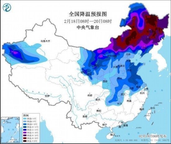 全國降溫預(yù)報(bào)圖(2月18日8時(shí)-20日8時(shí))