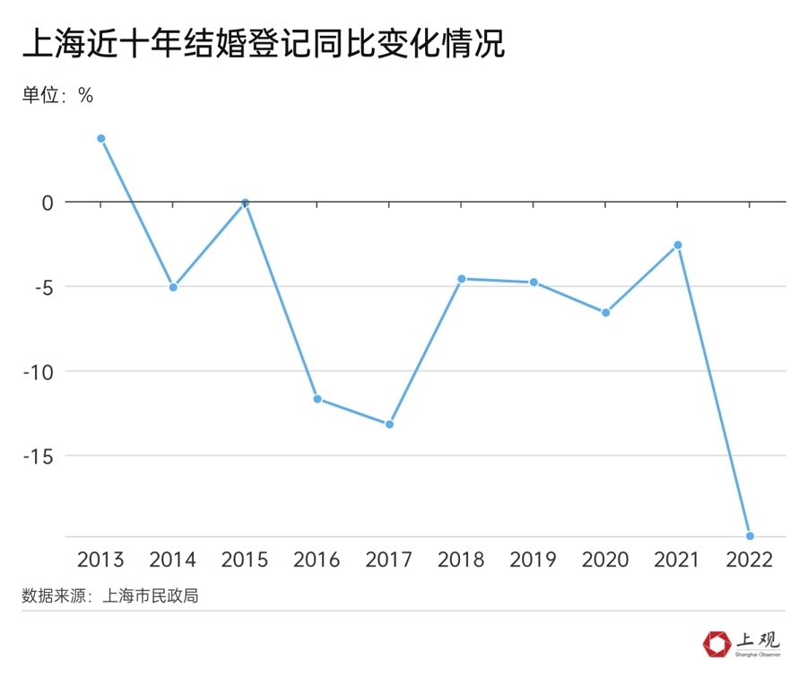 2022年,上海結婚領證的新人共有7.2萬對,是自1990年以來的最低值。雖說近20年來,結婚人數(shù)處于波動下降的趨勢,但2022年的降幅不尋常,遠超近十年平均水平(約為5%),相比2021年下降了約20%。