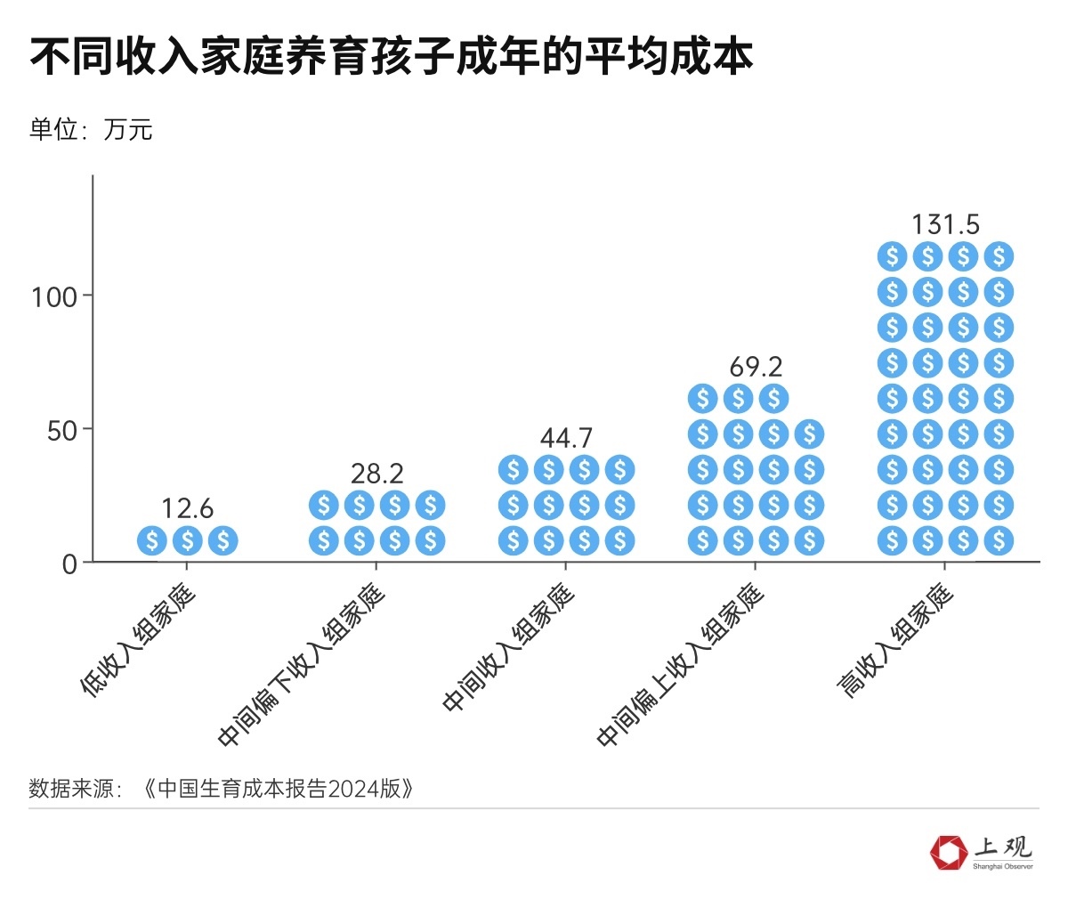 一線城市的成本則會更高。其中,在北京、上海養(yǎng)育一個孩子成年,平均成本分別達到93.6萬元、101萬元。以上海為例,養(yǎng)育孩子的開銷約占家庭收入的20%。