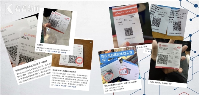 為了求證這一說法,記者來到了網(wǎng)友爆料的這家電影院,并提前通過三種渠道在線上購入了同天、同電影院、同場次、同排位置的三張電影票,分別花費(fèi)了56元、58元、49元。