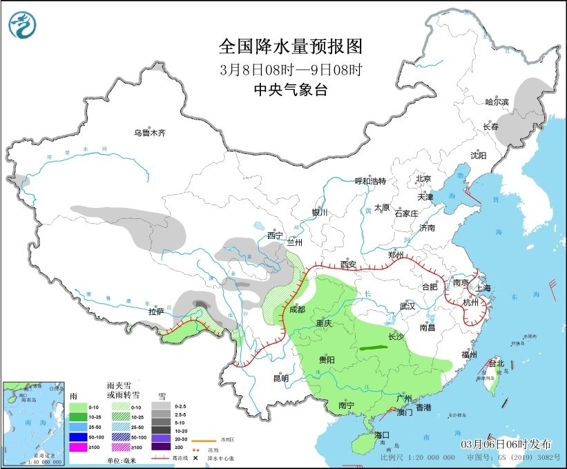 圖1 全國降水量預報圖(3月6日08時-7日08時)