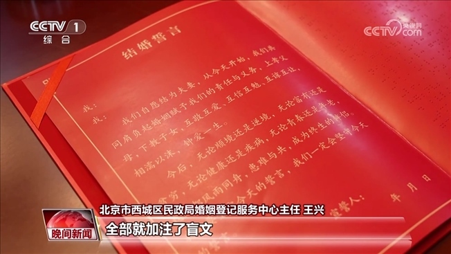 北京市西城區(qū)民政局婚姻登記服務(wù)中心主任 王興:我們通過這次活動也是跟盲文出版社正式把這個結(jié)婚登記的告知單,還有結(jié)婚誓言,全部就加注了盲文,等以后再有相同需求的殘疾人到我們婚姻登記(服務(wù)中心)登記結(jié)婚,我們會給他們提供一套相應(yīng)的流程。