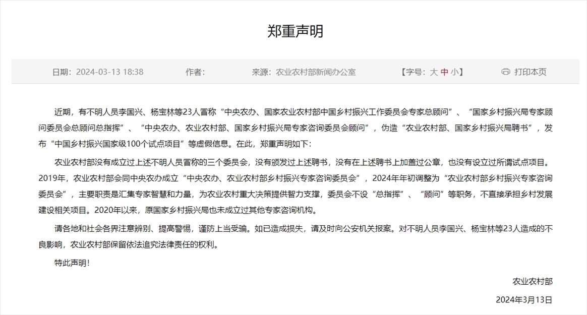 ·農(nóng)業(yè)農(nóng)村部鄭重聲明:沒有成立過不明人員冒稱的“中央農(nóng)辦、國家農(nóng)業(yè)農(nóng)村部中國鄉(xiāng)村振興工作委員會專家總顧問”、“國家鄉(xiāng)村振興局專家顧問委員會總顧問總指揮”、“中央農(nóng)辦、農(nóng)業(yè)農(nóng)村部、國家鄉(xiāng)村振興局專家咨詢委員會顧問”三個委員會,沒有頒發(fā)過上述聘書,沒有在上述聘書上加蓋過公章,也沒有設(shè)立過所謂試點(diǎn)項(xiàng)目。