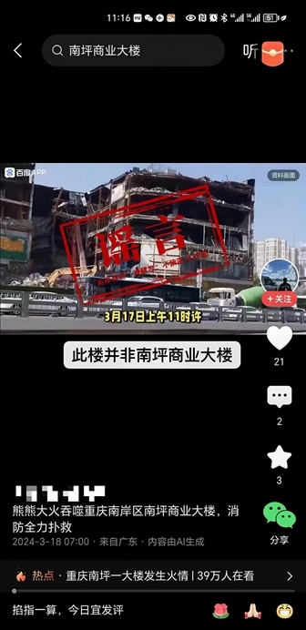 央視網(wǎng)消息:據(jù)“網(wǎng)信南岸”微信公眾號消息,3月18日,網(wǎng)傳消息稱“重慶南坪商業(yè)大樓突發(fā)大火,傷亡慘重”,有網(wǎng)友還發(fā)布了經(jīng)AI生成且圖文嚴重不符的視頻。經(jīng)核實,17日11時16分,南坪商業(yè)大廈住宅著火,區(qū)消防救援支隊和南坪街道及時到場處置,11時35分,現(xiàn)場明火熄滅,無人員傷亡,未發(fā)生次生事故。南岸辟謠提醒您,不造謠、不信謠、不傳謠!