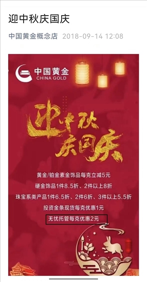 2018年,涉事門店的公眾號仍在宣傳無憂托管業(yè)務,消費者質疑中國黃金方面,為何沒有發(fā)現(xiàn)這家店經(jīng)營公司禁止的業(yè)務/受訪者供圖