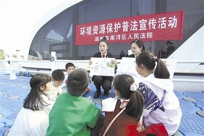 在第三十二屆“世界水日”來(lái)臨之際,浙江省湖州市南潯區(qū)人民法院法官走進(jìn)菱湖鎮(zhèn)省級(jí)濕地公園,將水資源保護(hù)和生態(tài)環(huán)境保護(hù)的法律知識(shí)以接地氣的方式向漁民及周邊游客宣講,并通過(guò)猜謎語(yǔ)、貼畫(huà)板等形式為小朋友上了一堂水資源保護(hù)法治課,形成良好的法治宣傳氛圍。圖為法官給小朋友上水資源保護(hù)法治課。