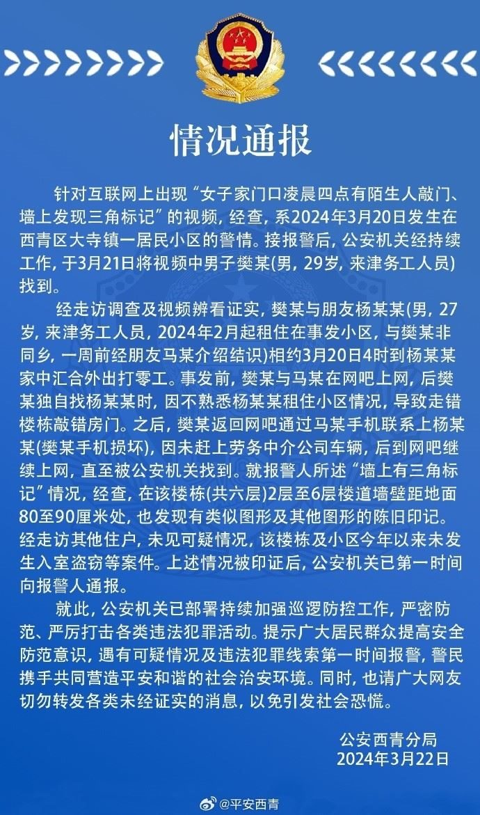 經(jīng)走訪調(diào)查及視頻辨看證實(shí),樊某與朋友楊某某(男,27歲,來津務(wù)工人員,2024年2月起租住在事發(fā)小區(qū),與樊某非同鄉(xiāng),一周前經(jīng)朋友馬某介紹結(jié)識)相約3月20日4時到楊某某家中匯合外出打零工。事發(fā)前,樊某與馬某在網(wǎng)吧上網(wǎng),后樊某獨(dú)自找楊某某時,因不熟悉楊某某租住小區(qū)情況,導(dǎo)致走錯樓棟敲錯房門。之后,樊某返回網(wǎng)吧通過馬某手機(jī)聯(lián)系上楊某某(樊某手機(jī)損壞),因未趕上勞務(wù)中介公司車輛,后到網(wǎng)吧繼續(xù)上網(wǎng),直至被公安機(jī)關(guān)找到。就報警人所述“墻上有三角標(biāo)記”情況,經(jīng)查,在該樓棟(共六層)2層至6層樓道墻壁距地面80至90厘米處,也發(fā)現(xiàn)有類似圖形及其他圖形的陳舊印記經(jīng)走訪其他住戶,未見可疑情況,該樓棟及小區(qū)今年以來未發(fā)生入室盜竊等案件。上述情況被印證后,公安機(jī)關(guān)已第一時間向報警人通報。