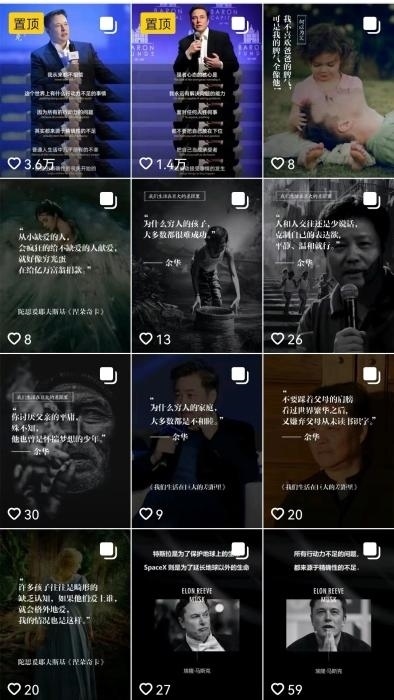 “滿屏皆是馬斯克”之外,在一些雞湯類(lèi)賬號(hào)里,作家余華、知名投資人沃倫·巴菲特等也是“高產(chǎn)”創(chuàng)作者。