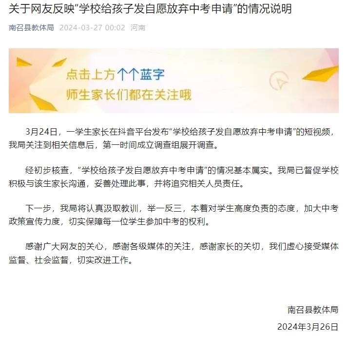 央視網(wǎng)消息:南召縣教體局3月27日發(fā)布《關(guān)于網(wǎng)友反映“學(xué)校給孩子發(fā)自愿放棄中考申請”的情況說明》。