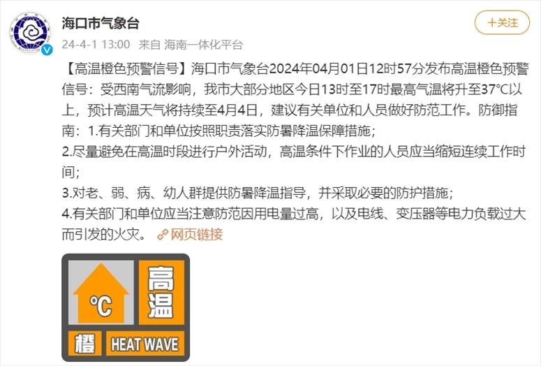 央視網(wǎng)消息:據(jù)@??谑袣庀笈_ 微博消息,海口市氣象臺2024年04月01日12時57分發(fā)布高溫橙色預(yù)警信號:受西南氣流影響,海口市大部分地區(qū)今日13時至17時最高氣溫將升至37℃以上,預(yù)計高溫天氣將持續(xù)至4月4日,建議有關(guān)單位和人員做好防范工作。