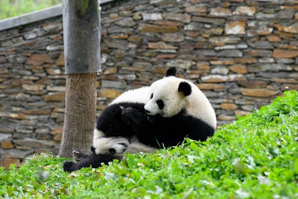 2022年4月24日,在中國大熊貓保護研究中心臥龍神樹坪基地內,一只大熊貓和大熊貓幼崽在玩耍。新華社記者 胥冰潔 攝