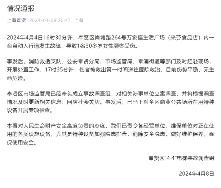 ·身體被卷入扶梯女子面臨截肢風險,屬地政府及街道辦等部門均已介入。上海奉賢通報稱成立事故調(diào)查組。