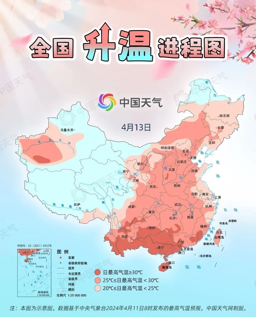 眼下,全國(guó)大部處于冷空氣影響間歇期,升溫是主旋律。預(yù)計(jì)今起三天(4月11日至13日),我國(guó)從北到南都將開(kāi)啟回暖進(jìn)程,最高氣溫25℃以上的區(qū)域幾乎覆蓋整個(gè)中東部,波及20余省份,東北、西北地區(qū)氣溫將大面積創(chuàng)今年以來(lái)新高,北方不少地方還會(huì)體驗(yàn)到常年5月中旬才有的超前暖熱。中國(guó)天氣網(wǎng)推出全國(guó)升溫進(jìn)程圖,看看哪些地方將沖擊30℃。