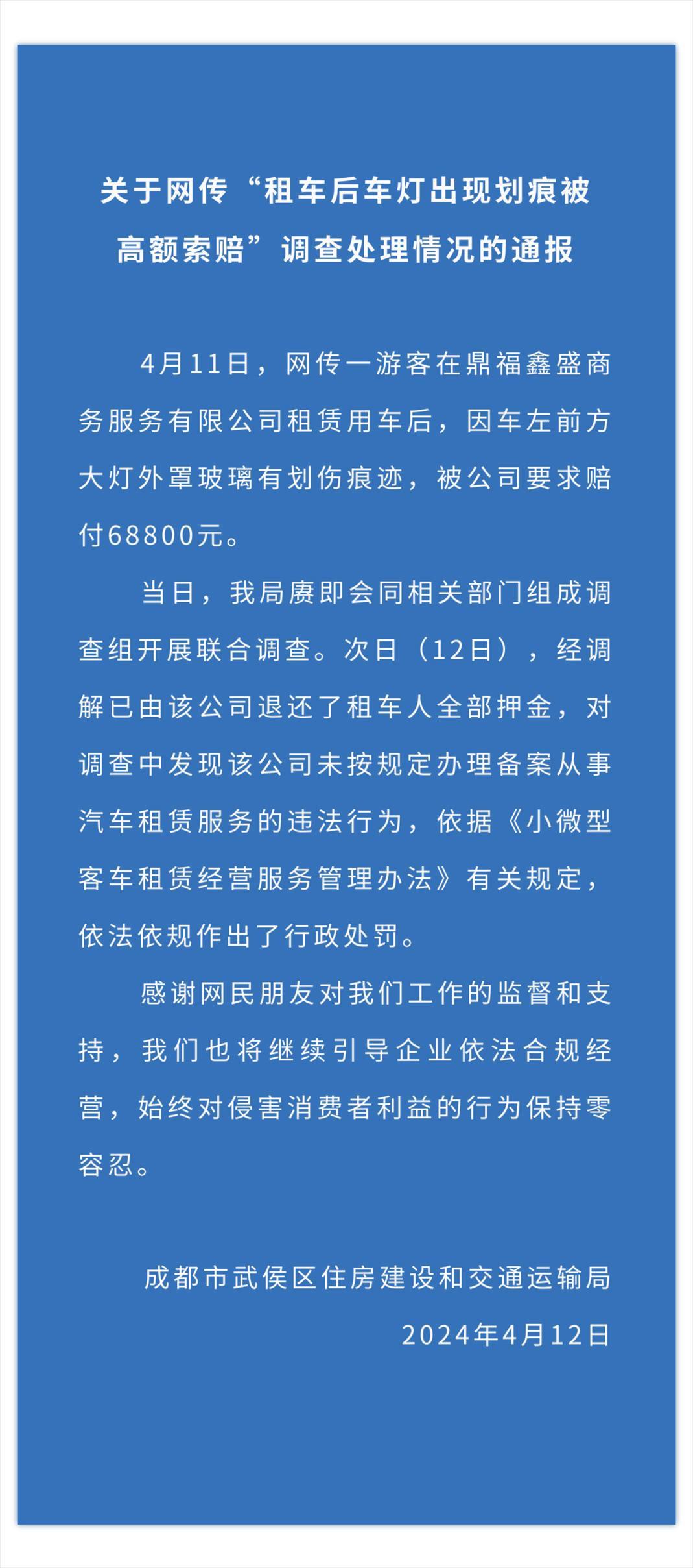 央視網(wǎng)消息:成都市武侯區(qū)住房建設(shè)和交通運(yùn)輸局4月12日晚發(fā)布通報(bào),4月11日,網(wǎng)傳一游客在鼎福鑫盛商務(wù)服務(wù)有限公司租賃用車后,因車左前方大燈外罩玻璃有劃傷痕跡,被公司要求賠付68800元。當(dāng)日,我局賡即會同相關(guān)部門組成調(diào)查組開展聯(lián)合調(diào)查。次日(12日),經(jīng)調(diào)解已由該公司退還了租車人全部押金,對調(diào)查中發(fā)現(xiàn)該公司未按規(guī)定辦理備案從事汽車租賃服務(wù)的違法行為,依據(jù)《小微型客車租賃經(jīng)營服務(wù)管理辦法》有關(guān)規(guī)定,依法依規(guī)作出了行政處罰。