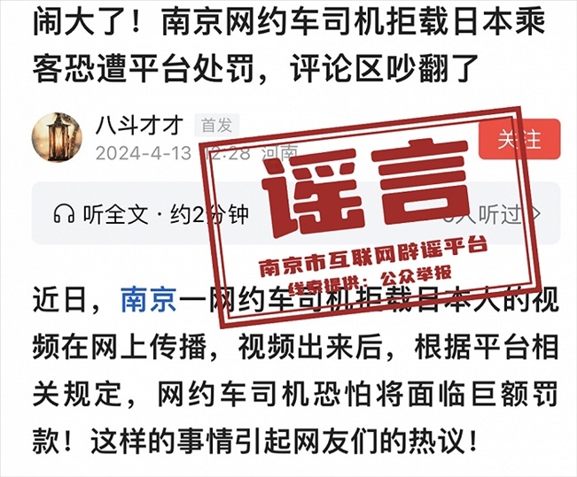 央視網(wǎng)消息:南京網(wǎng)絡(luò)辟謠官微消息,近日,網(wǎng)上流傳“一名日本游客在南京使用網(wǎng)約車服務(wù)時,遭遇司機拒載”的消息,并配有車內(nèi)監(jiān)控畫面。有自媒體捏造稱,南京市交通局發(fā)布了緊急通告,表示將對涉事網(wǎng)約車司機進行嚴(yán)肅處理。一時之間,引發(fā)不少評論和爭議。