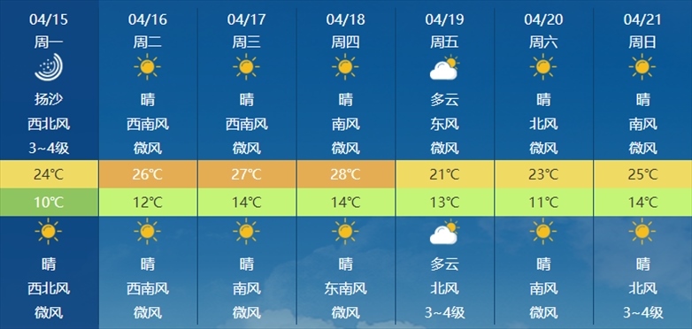 根據(jù)氣象部門預(yù)報(bào),本周天氣以晴和多云為主,氣溫總體回升,周四白天最高氣溫預(yù)計(jì)將達(dá)到28℃。天氣條件總體適宜出行,晝夜溫差仍較大,還需注意適時(shí)增減衣物,謹(jǐn)防感冒。