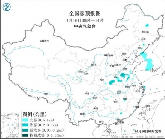 全國霧預(yù)報圖(4月16日08時-16日14時)